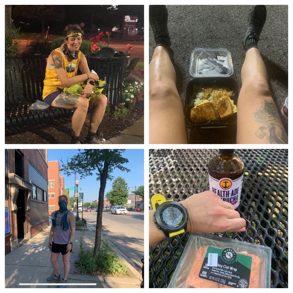 For most of the night, I’m walking, with some spurts of running. I’m achingly hungry, with nausea coming in waves. My feet are screaming at me and I know they’re a mess in there. When we see a 24-hour Denny’s, that’s open, I’m elated! Craving a simple grilled cheese, but thinking I need more substance, I order an Eggs Over My Hammy sandwich and use the bathroom while they prepare it. We sit in the parking lot on a concrete wheel stop in a distant parking space, and I’m so uncomfortable that I can’t eat much. Sitting so low to the ground, with my torso and things flexed, compresses my abdomen in a way that does no favors for my nausea. It’s disappointing that I can’t eat much, and I choke down as much of the egg as I can.