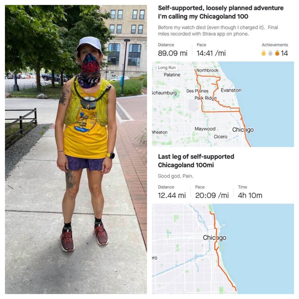 Finally, I meet Nathan near the Mag Mile. It’s an absolute shit show and feels like complete mayhem. I’m often overwhelmed by this part of town, but right now everything is amplified. But, there are bathrooms and food and Nathan. Nathan is amazing. Really. Just the best partner anyone can ask for. I’m filled with gratitude and my circuits are overloaded. I cry again. One the f*ing Mag Mile. Under my buff and sunglasses. Dirty, limping, masked, while people stream past, ignoring me and distance. I think about the saying “Nobody cares you run ultras” and am reminded that it’s true. But then I think about what ultra-events really are in “normal” times. In normal times, everyone is there to cheer you on! People volunteer to help you on your journey, you meet fellow travelers and share your most intimate thoughts. The experience leads to deep connections between self, community, joy and pain. Here—I was the only one who knew what I had just been though. A good reminder to be gentle and kind to others. I do not know what they have been through either. This brings me back, again, to thinking about invisible wounds. Things like grief, pain and mental health struggles at first, but the metaphor can easily be extended to race, gender identity, addiction and poverty. Be kind to self and others. The work weakens the monsters.